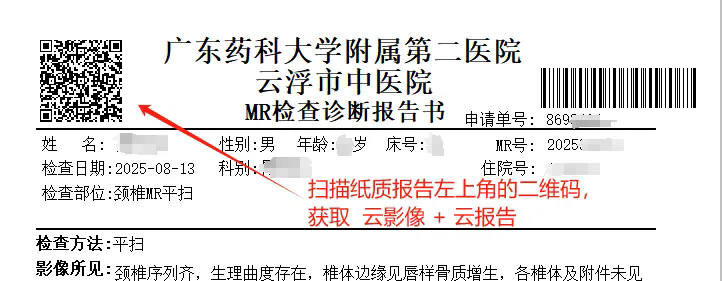 患者在我院就诊时,扫描放射科纸质报告的二维码,输入身份证号码校验,就能查看云影像+云报告了。具体步骤如下: