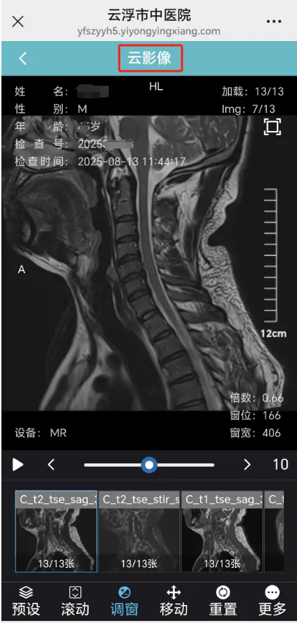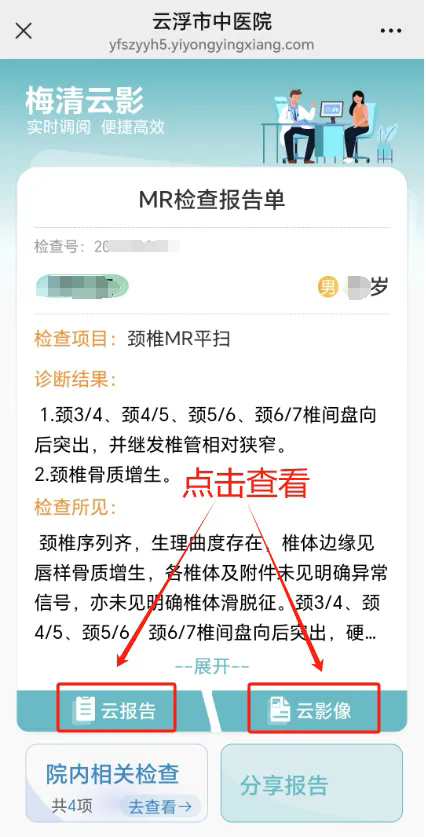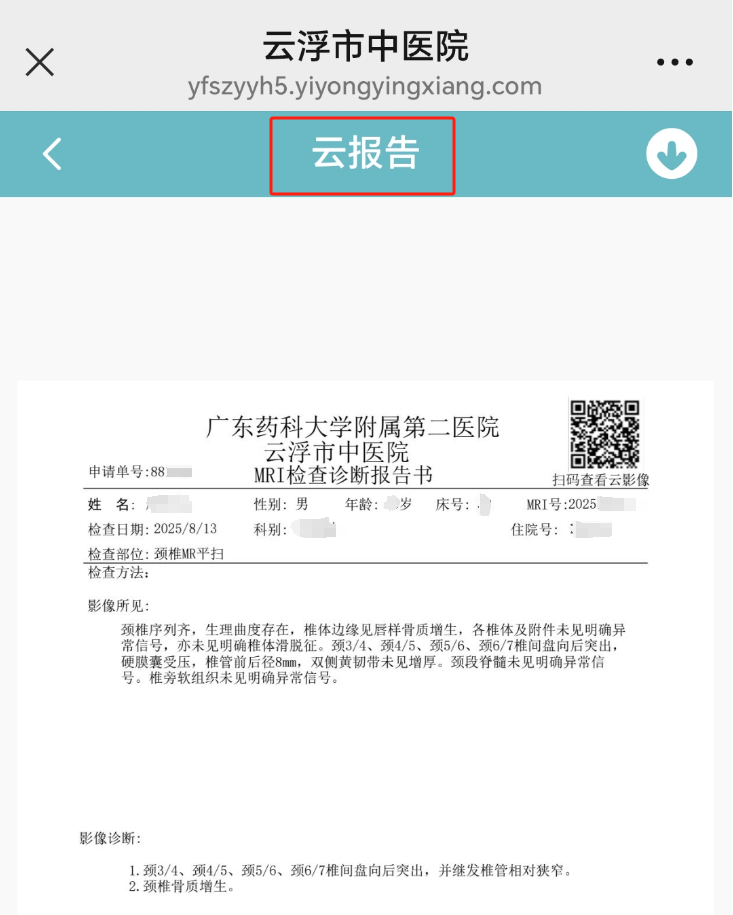 患者在我院就诊时,扫描放射科纸质报告的二维码,输入身份证号码校验,就能查看云影像+云报告了。具体步骤如下: